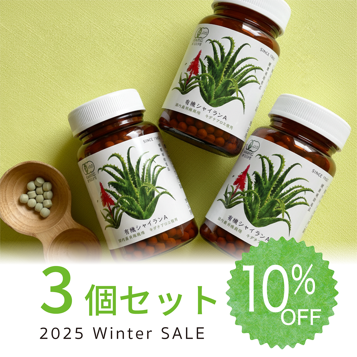 アロエの葉皮には、強い苦味の特有成分、「アロイン」や「アロエニン」が含まれています。 キダチアロエの健康食品は、葉皮ごと加工するため、その特有成分を余すことなく身体に取り入れることができます。その働きにより、スッキリ、スムーズな生活をサポートします。苦味が苦手と言う方には、粒にすることで飲みやすくした、『有機シャイランA』がおすすめです。